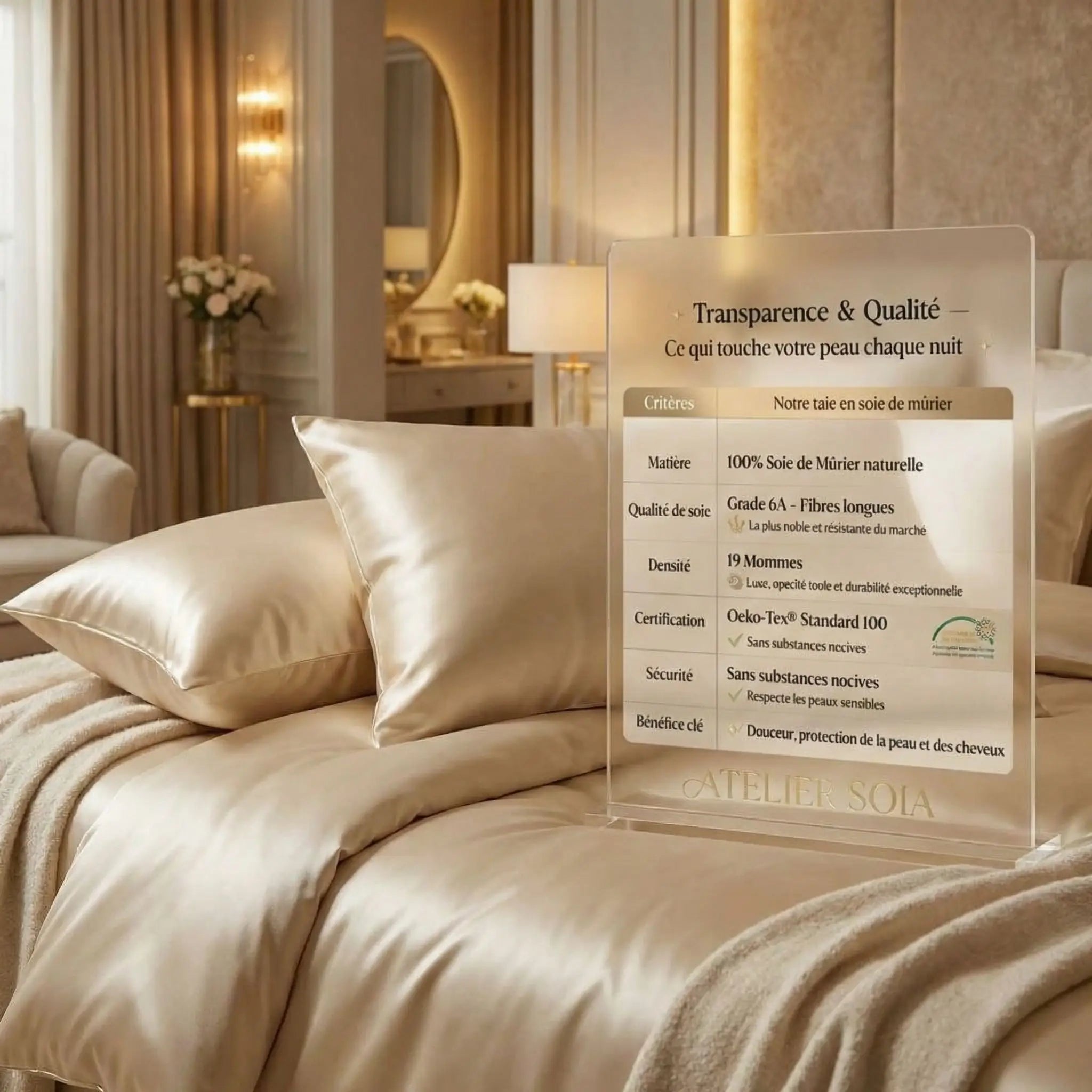 La taie SOIA en soie de mûrier réduit les marques du sommeil, limite les frisottis et préserve l’hydratation naturelle de la peau et des cheveux.
